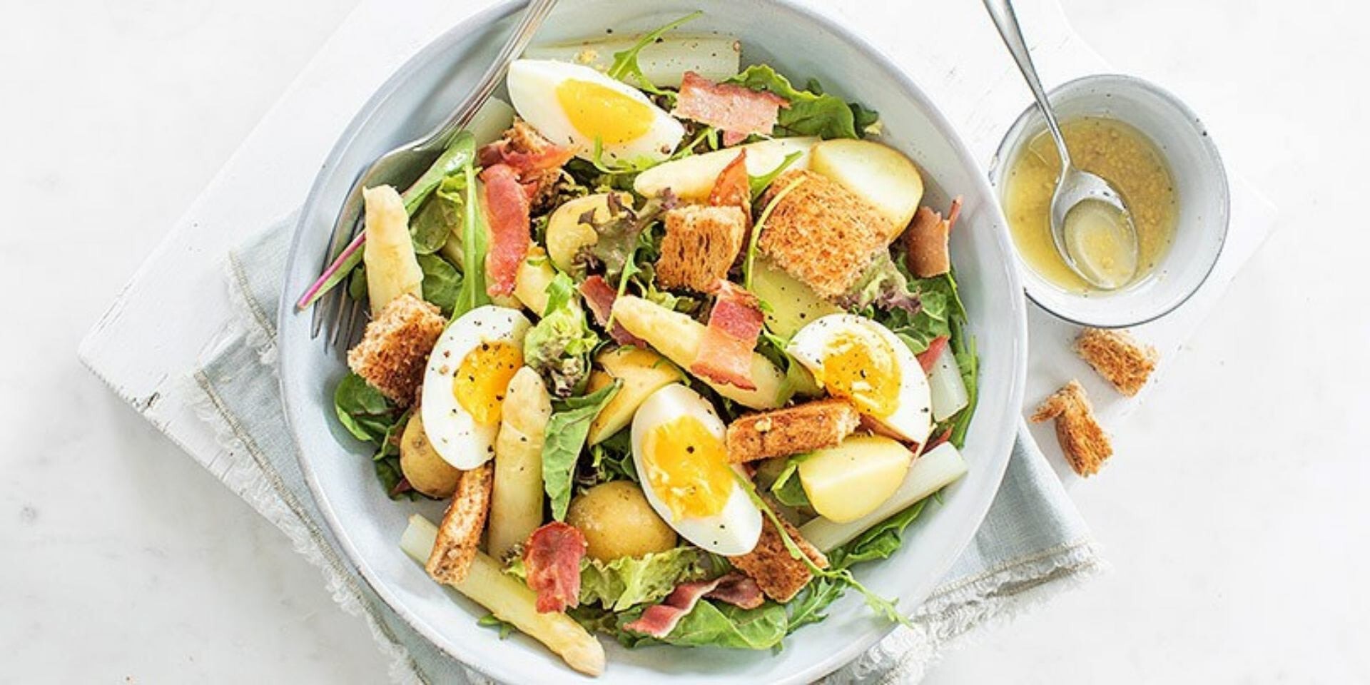 Verdeel de rucola over twee borden, leg de asperges erop en verdeel de eieren.