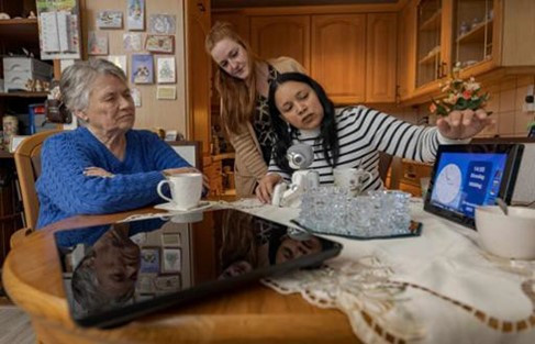 Nettie Coonenbelders krijgt uitleg van Meandermedewerkers Indy Jansen (met gestreepte trui) en Kimberly Grijmans over digitale hulpmiddelen die Meander gebruikt om mensen thuis te begeleiden. © LUC LODDER