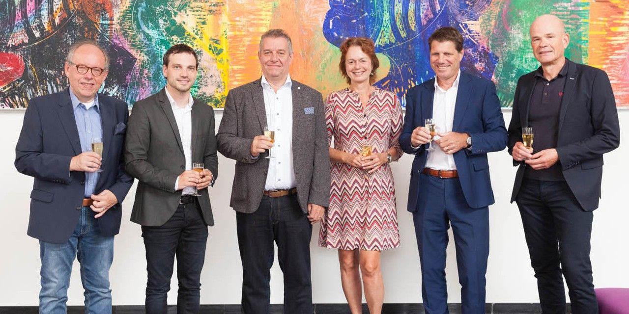 Ondertekening van de samenwerkingsovereenkomst met gemeente Heerlen, Landgraaf en Voerendaal op 5 september. Van links naar rechts: de heer A. Schiffelers, wethouder gemeente Landgraaf, de heer J. Clemens, wethouder gemeente Heerlen, de heer H. Coenen, wethouder gemeente Voerendaal, mevrouw A. Pijls, raad van bestuur XONAR, de heer J-P Essers, raad van bestuur Mondriaan en de heer E. Hoesbergen, raad van bestuur Alcander (Welzijnsgroep Parkstad) die namens de coöperatie JenS hebben ondertekend.