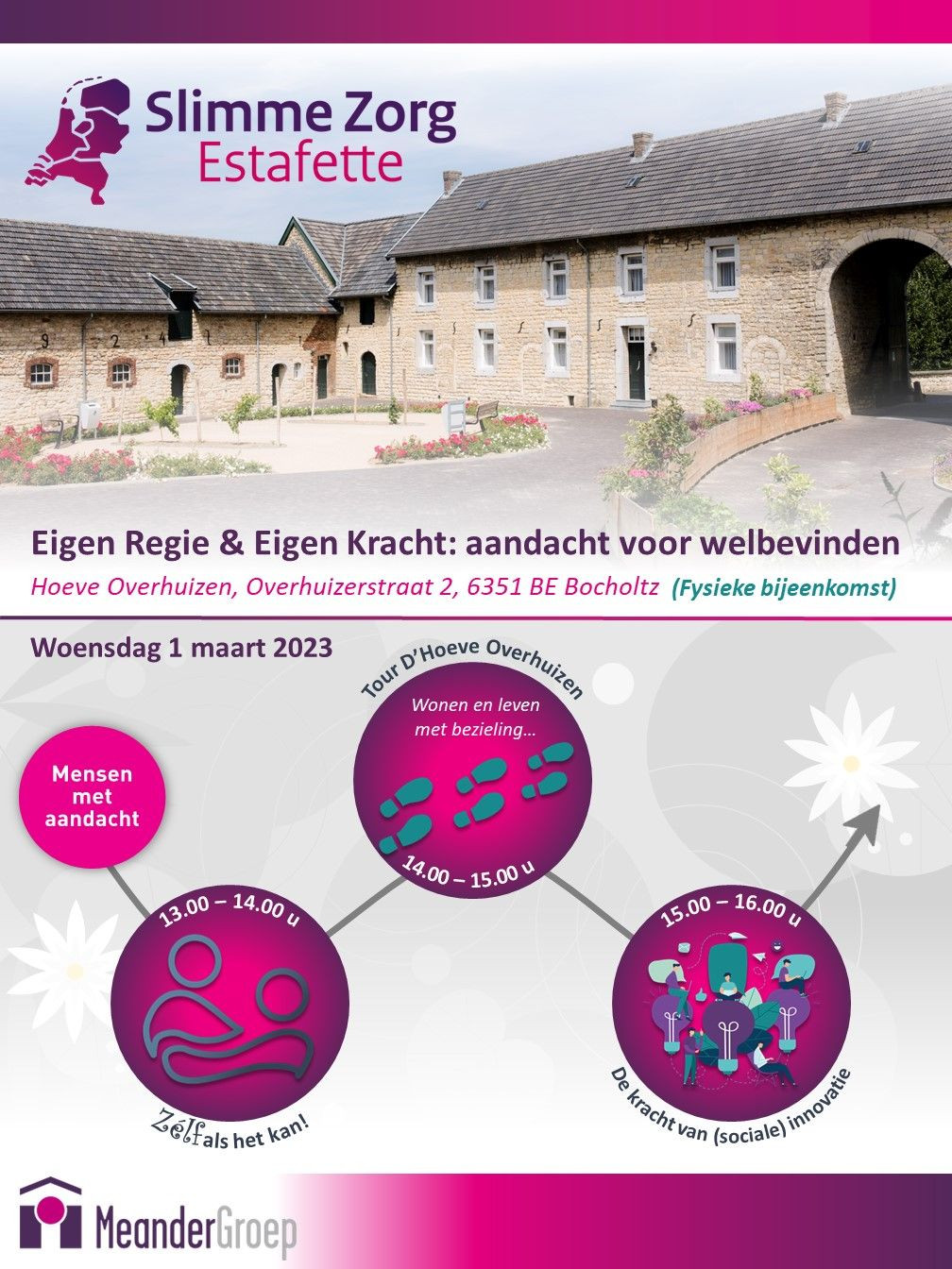 Tijdens de Slimme Zorg Estafette staat innovatie in zorg, welzijn en preventie landelijk centraal. In het kader daarvan organiseert MeanderGroep het evenement 'Eigen Regie & Eigen Kracht: aandacht voor welbevinden'. Hierin nemen wij u mee in hoe wij eigen regie en eigen kracht stimuleren, zodat onze klanten en bewoners een actief en betekenisvol leven kunnen leiden. Door middel van uitdagende workshops en een rondleiding door onze prachtige locatie Hoeve Overhuizen.