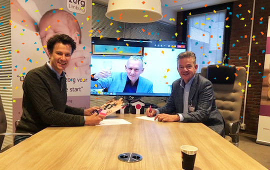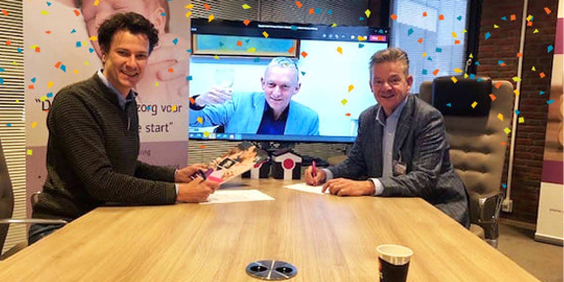 Op de foto: Mark Schellings, bestuurder Geboortezorg (links), Roger Ruijters, bestuurder Envida (op het scherm) en Jack H.L. Jansen, bestuursvoorzitter MeanderGroep (rechts).
