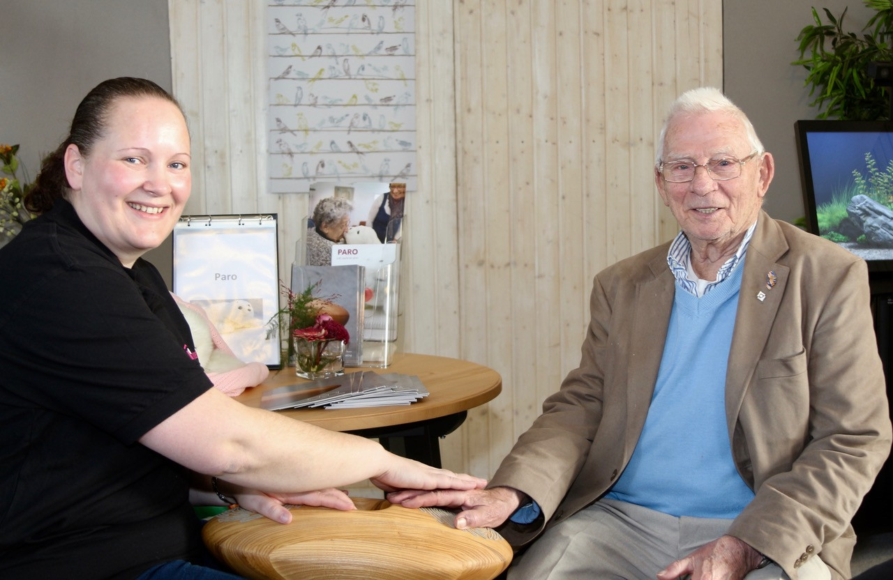 In de thuiszorgkamer kunnen bezoekers plaatsnemen in de relaxfauteuil, bekijken hoe je met een hulpmiddel steunkousen aan- en uittrekt en hoe de raiser wordt gedemonstreerd: een apparaatje waarmee je iemand na een val heel gemakkelijk omhoog krijgt. Verder zijn er drukbezochte demonstraties van de Medido (een automatische medicijndispenser), de midline (een infuusmethode via echo-geleiding) en het flexobed. De huiskamer verderop is ingericht als zijnde een kamer in een wijkzorgcentrum/verpleeghuis. Er is een digitale belevenistafel waar herinneringen aan vroeger kunnen worden opgehaald. Robotzeehond Paro is er weer en ook de Crdl: een houten muziekblok dat reageert op aanraking. Wanneer je het blok streelt, volgt er een ander tegengeluid dan wanneer je erop tikt. “Zo kun je beter contact krijgen met dementerenden”, legt medewerkster Suzanne van Loo uit. Twee dames uit Kerkrade staan bij de belevenistafel. Als tachtig plussers drukken ze ietwat huiverig op de toetsen. Foto’s van vroeger verschijnen in beeld. “Oh die pannen hadden we thuis ook” klinkt het al gauw en even later lijkt de angst voor de techniek als sneeuw voor de zon verdwenen. Er wordt geklikt en elk nieuw object geeft voldoende stof om over te praten.