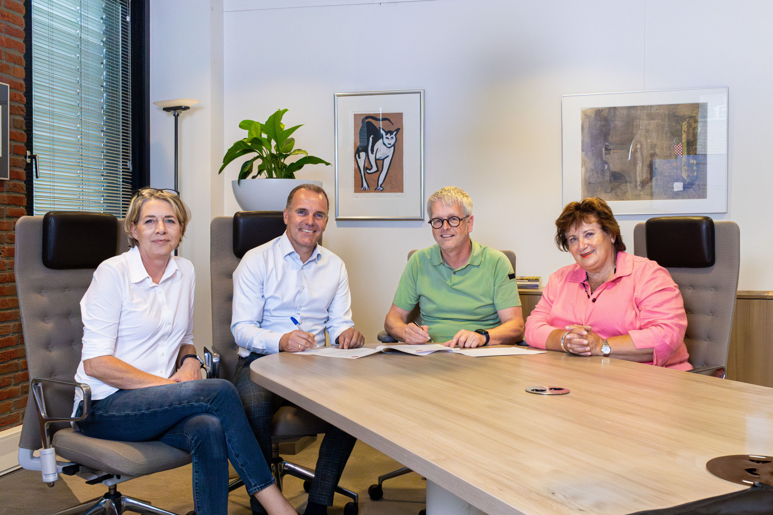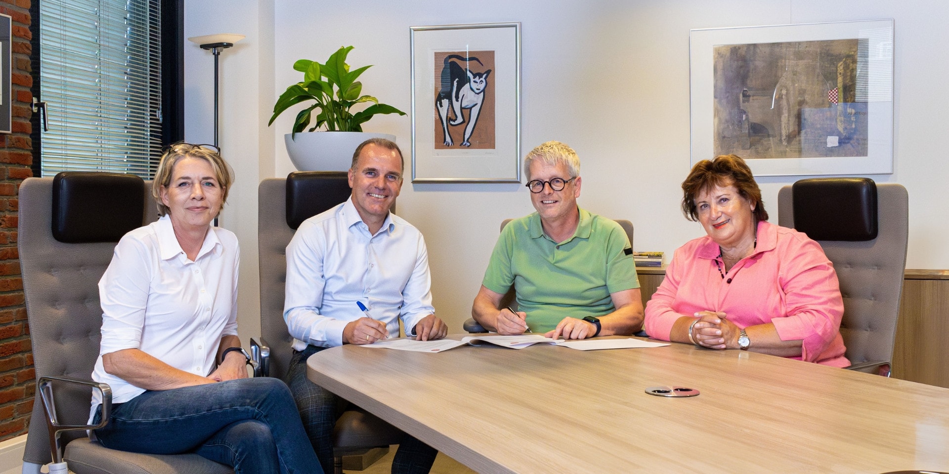𝙊𝙥 𝙙𝙚 𝙛𝙤𝙩𝙤 𝙫𝙖𝙣 𝙡𝙞𝙣𝙠𝙨 𝙣𝙖𝙖𝙧 𝙧𝙚𝙘𝙝𝙩𝙨: Anja Stevelmans, teamleider Inkoop MeanderGroep, Corne Ligthart, directeur Zorgapotheek, Jan Hamers, bestuursvoorzitter MeanderGroep & Mieke Franssen, clusterdirecteur Wonen met Expertisezorg MeanderGroep.