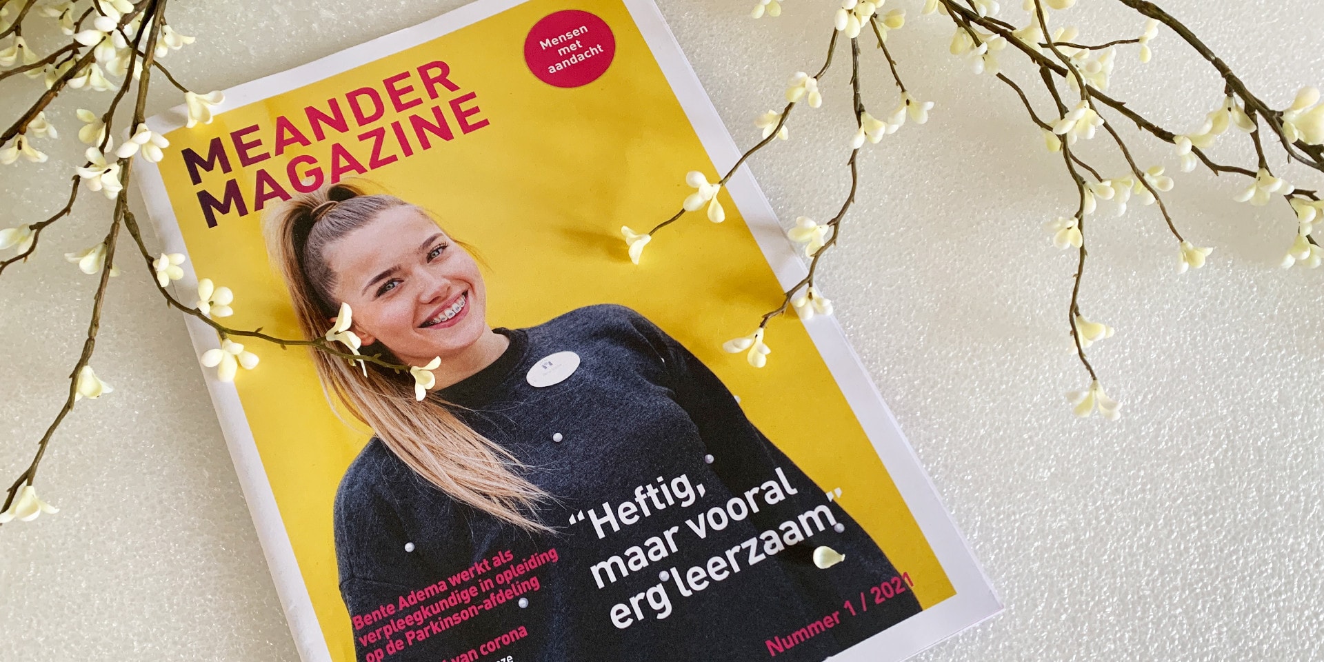 In deze uitgave vertellen Bente, Milou en Dominique over hun ambities in de zorg. Vol trots van hoe ze ooit gestart zijn en hoe ze zichzelf hebben kunnen ontwikkelen binnen Meander. Ook leest u welke impact corona heeft in onze wijkzorgcentra en verpleeghuizen. Dat er ook mooie dingen gebeuren bewijst het verhaal van twee bewoners binnen de Hambos die nu een liefdeskoppel vormen. Dit en nog veel meer verhalen uit de zorg maken het weer tot een boeiende uitgave. Klik hier voor de bladerbare versie. Voor alle meander magazines, klik hier.