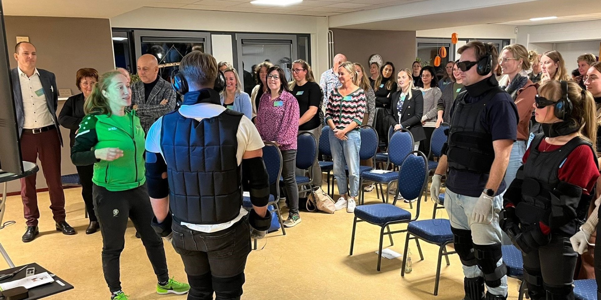 De avond werd afgesloten met een belevingssessie door NOVIzorg, waarin alle deelnemers cognitief én fysiek werden uitgedaagd. Dit bleek extra zwaar voor de vier vrijwilligers in een verouderingspak, die de symptomen van Parkinson nabootsten. Het was een heel geslaagde avond voor alle betrokkenen!